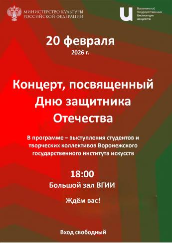 Создай с нами свой прототип! ПодробнееЦентр исполнительских искусств и светового дизайна ПРИГЛАШАЕМ НА ОБУЧЕНИЕ Музыкальный факультет Театральный факультет Факультет живописи ПодробнееАбитуриентам Информация для абитуриентов о целевом обучении ПодробнееЦелевое обучение Высокое качество образования Военная служба по контракту в специализированные подразделения войск беспилотных систем Ведущий институт искусств в ЧерноземьеСтуденты узнают все о творчестве Рембрандта Харменса ван Рейна на лекции с Третьяковской галерей Предыдущий Pause Следующий 01/09Скачай и общайся в Российском мессенджере МАХПодробнее 03/09Пушкинская картаПодробнее 20/01Военная служба по контракту в специализированные подразделения войск беспилотных систем Подробнее 28/05В 2030 году состоится празднование 650-летие Куликовской битвыПодробнее Новости 17/02 В институте состоялась встреча с участником СВО 16/02 Поздравляем наших талантливых гитаристов! 16/02 Состоялся концерт выпускниц ВГИИ 15/02 День памяти воинов-интернационалистов Все новости События Ежегодно ВГИИ проводит более 200 мероприятий, среди которых международные театральные фестивали, творческие лаборатории, мастер-классы, научные конференции, международные образовательные проекты, выставки и показы спектаклей. 27/03 пт 12:15 Курсы повышения квалификации 28/02 сб 18:00 Гала-концерт домристов Воронежа 22/02 вс 15:00 Концерт кафедры оркестровых инструментов Все события Полезные ссылки