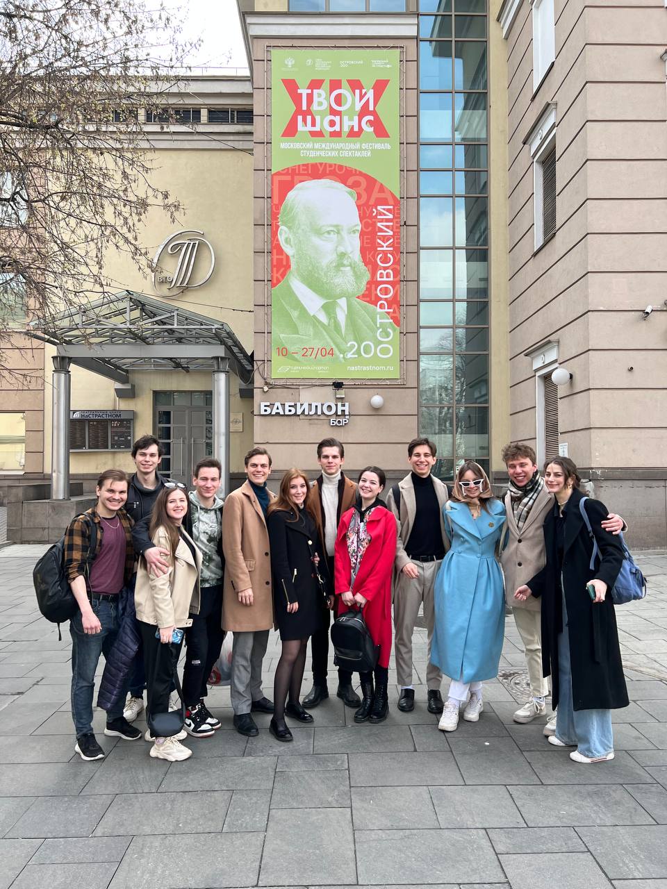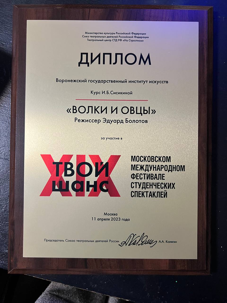 12.04.2023 Студенты 4 курса театрального факультета участвовали в фестивале "Твой Шанс" в Москве 11 апреля. Их спектакль "Волки и овцы" А.Н Островского был успешно представлен на фестивале.