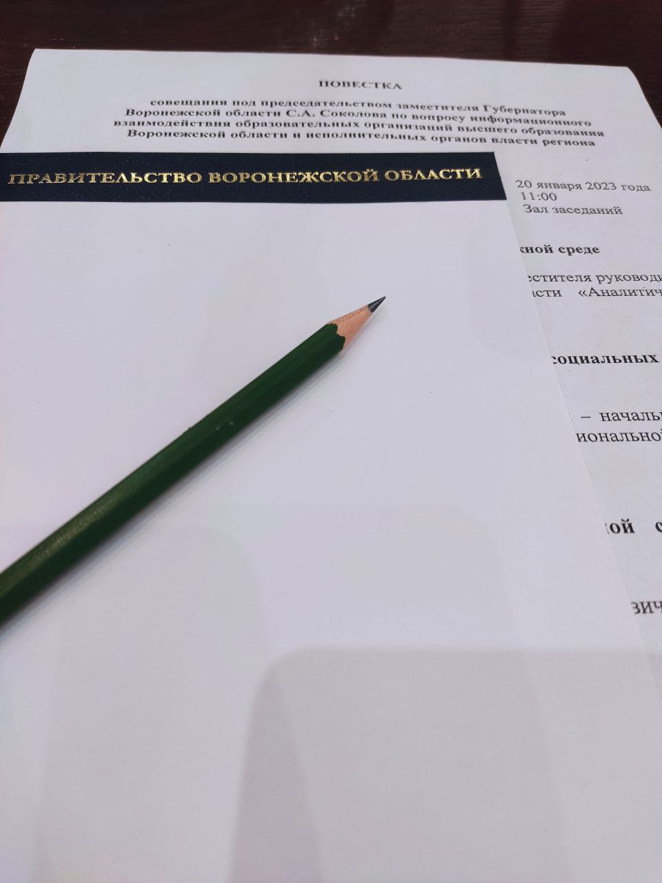 Сегодня в Правительстве Воронежской области прошло Совещание под председательством заместителя Губернатора Соколова Сергея Анатольевича по вопросу информационного взаимодействия образовательных организаций высшего образования Воронежской области и исполнительных органов власти региона. Представитель от ВГИИ - начальник отдела по работе со студентами и молодежной политике - Филонович Светлана Александровна. Выслушали несколько докладчиков по темам: "Состояние общественного мнения в молодежной среде"; "Единое информационное пространство в социальных сетях: возможности и риски"; "Информационные риски в молодежной среде и меры реагирования на них".