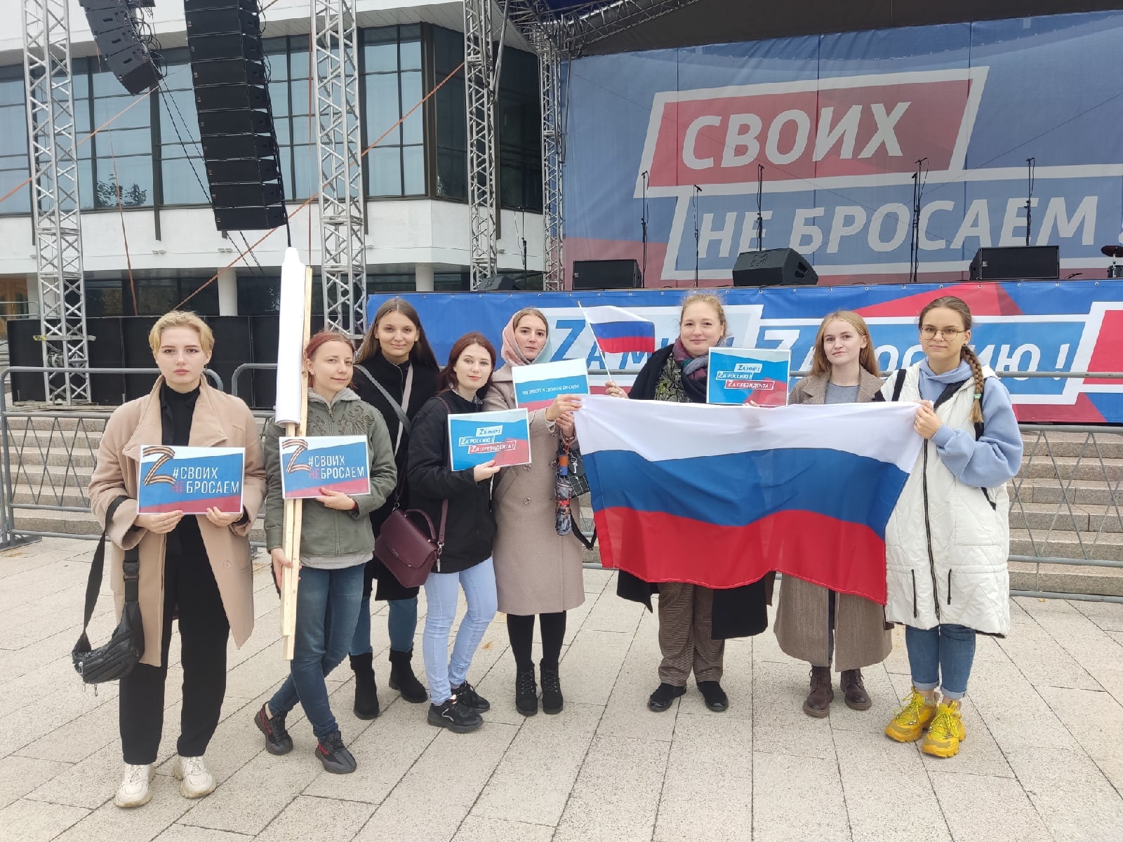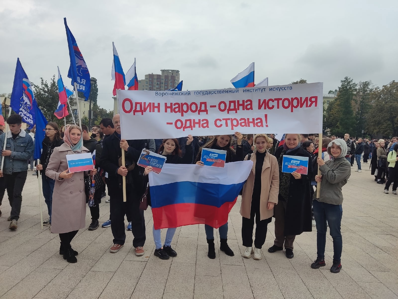 Студенты и сотрудники Воронежского государственного института искусств присоединились к гражданско-патриотической акции «Своих не бросаем!». Мероприятие прошло во многих регионах России в поддержку референдумов в Донецкой и Луганской народных республиках, в Запорожской и Херсонской областях о присоединении к России.