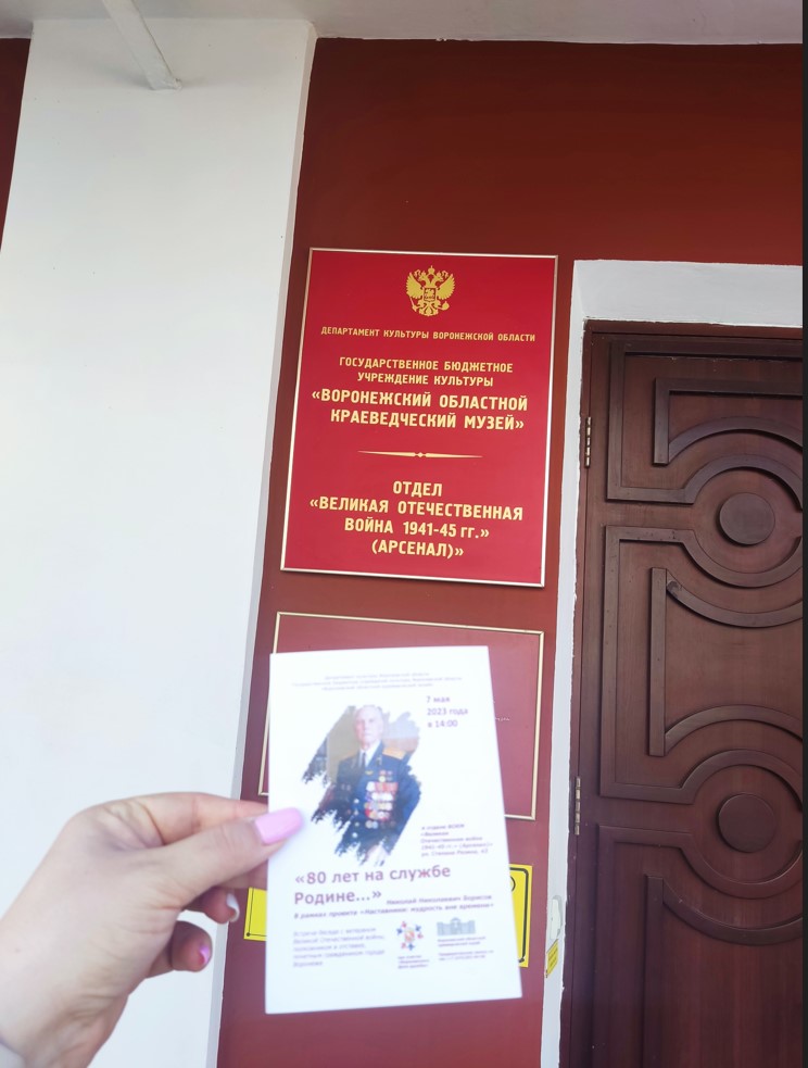 7 мая 2023 года в отделе ВОКМ «Великая Отечественная война 1941-1945 гг.» («Арсенал») состоялась встреча-беседа «80 лет на службе Родине» с ветераном Великой Отечественной войны, полковником в отставке, Почётным гражданином города Воронеж - Николаем Николаевичем Борисовым (98 лет).