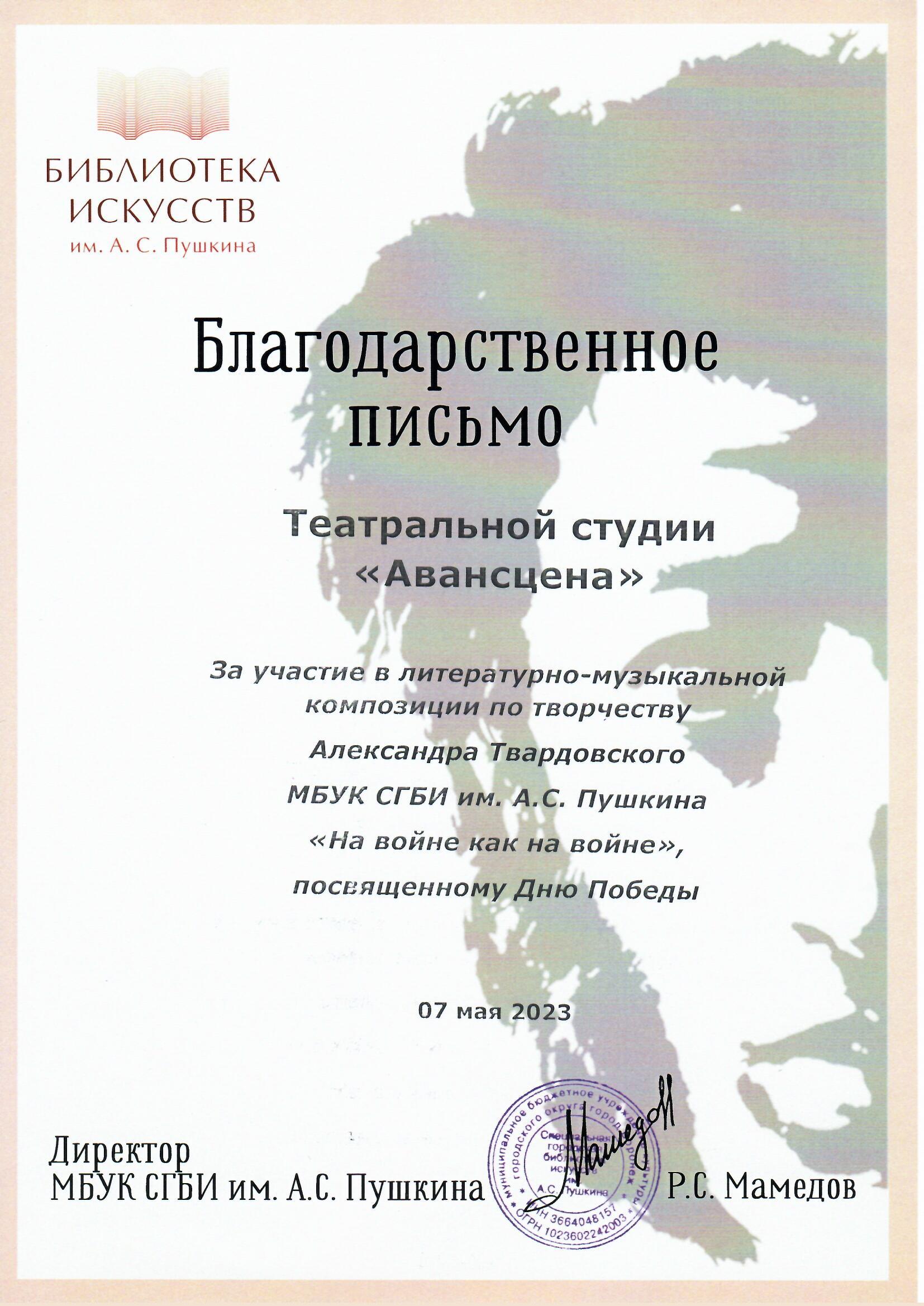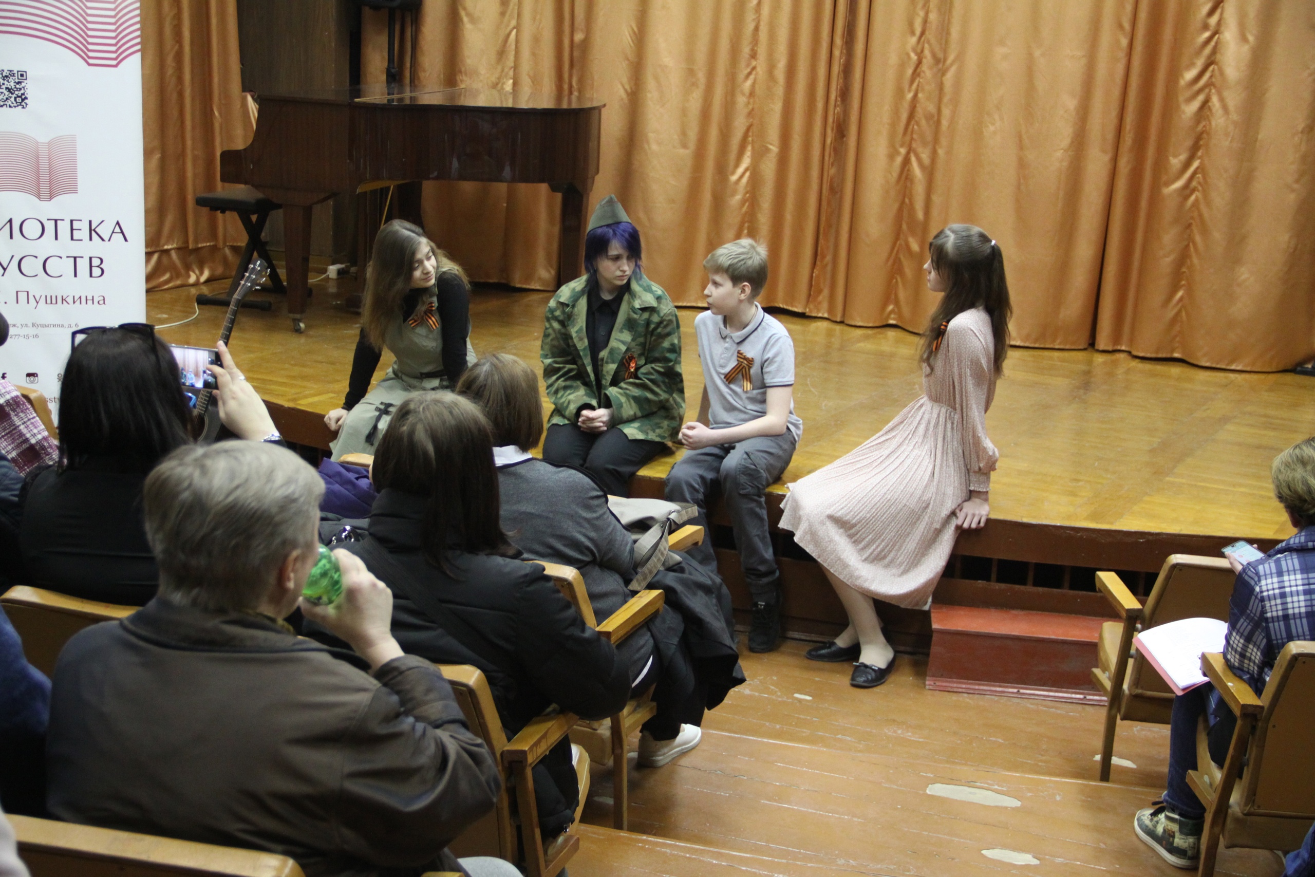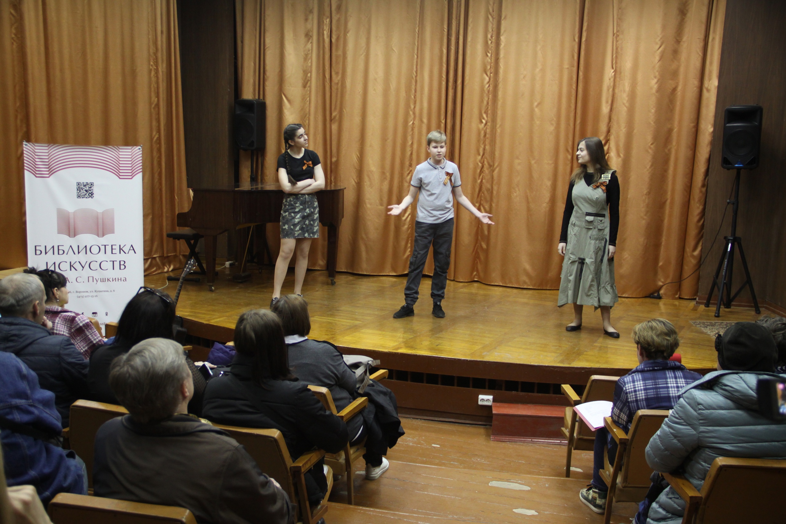 Детская театральная студия «Авансцена» ВГИИ показала музыкально-литературную композицию «На войне как на войне» по произведениям А.Т. Твардовского в городской библиотеке искусств им. А.С. Пушкина. Программа была подготовлена старшей группой театральной студии под руководством Заслуженной артистки Воронежской области Магдалены Магдалининой.
