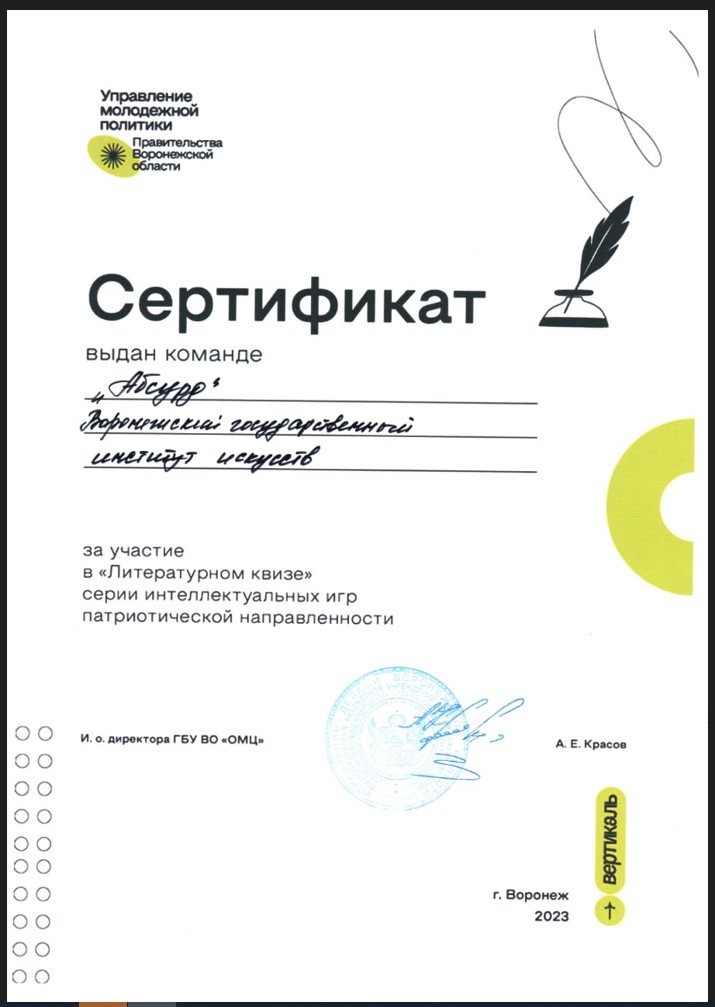 В состязании приняла участие команда ВГИИ "Абсурд", состоящая из студентов 2 курса Театрального факультета: Старокожев Дмитрий, Кветная Дарья, Родионова Вера, Перепечаева Елизавета, Волина Карина, Миненко Анастасия. Команда продемонстрировала высокий уровень знаний и умение работать в коллективе. По результатам игры "Абсурд" занял почётное 2-е место, за что была вручена дипломная награда.