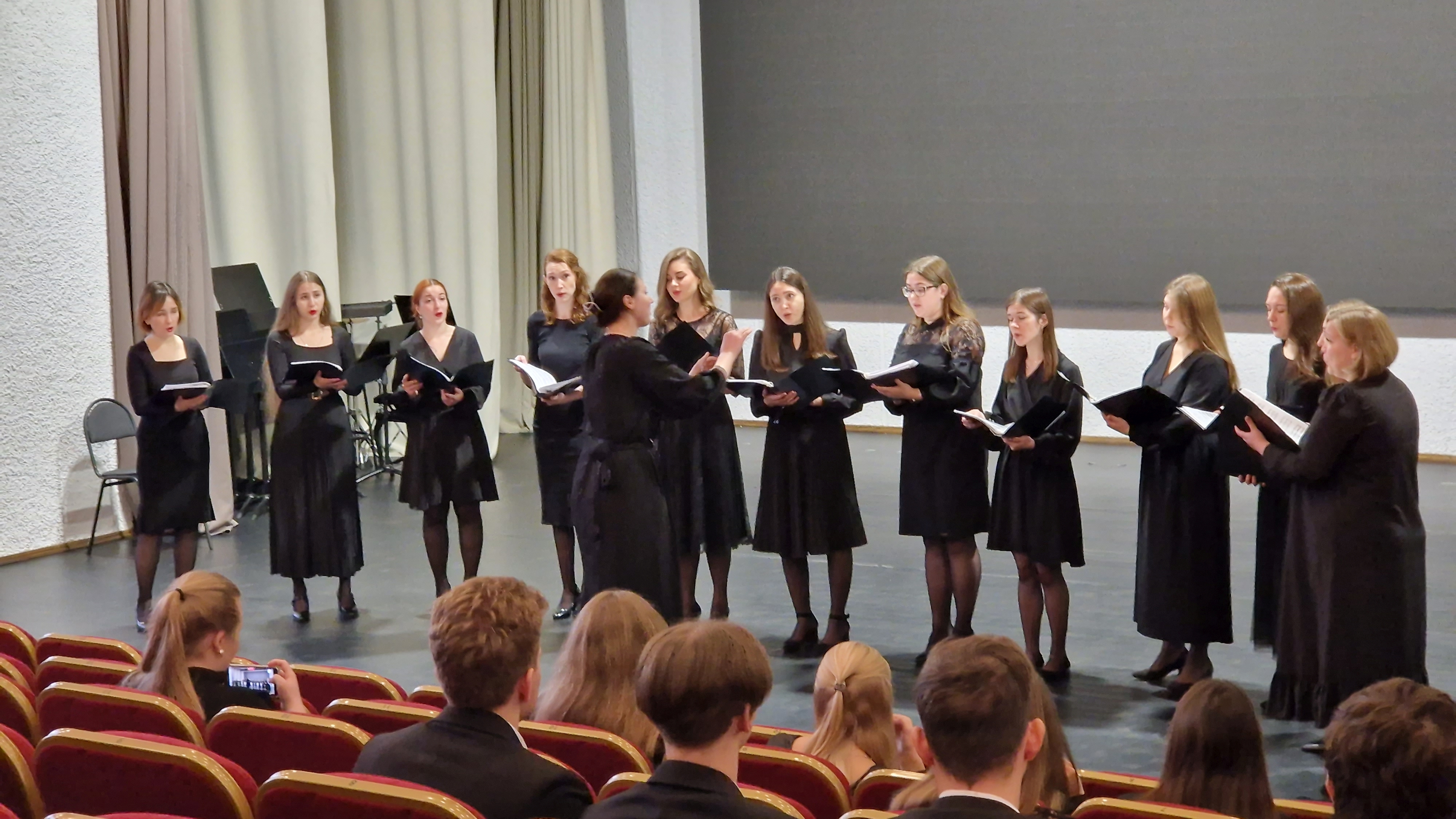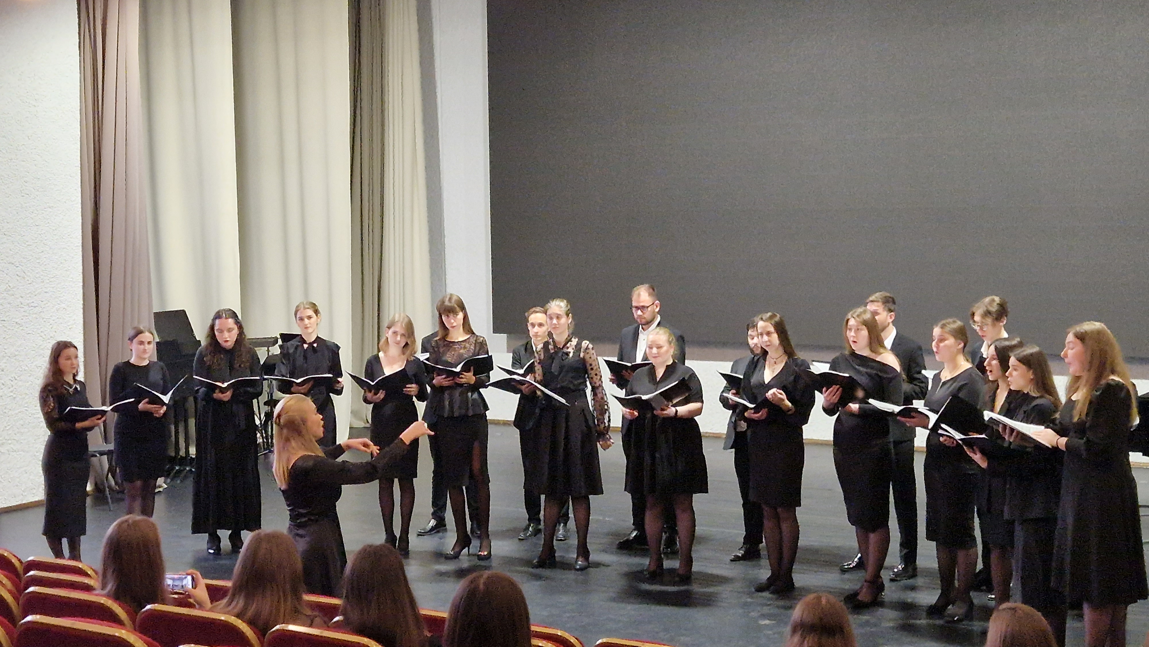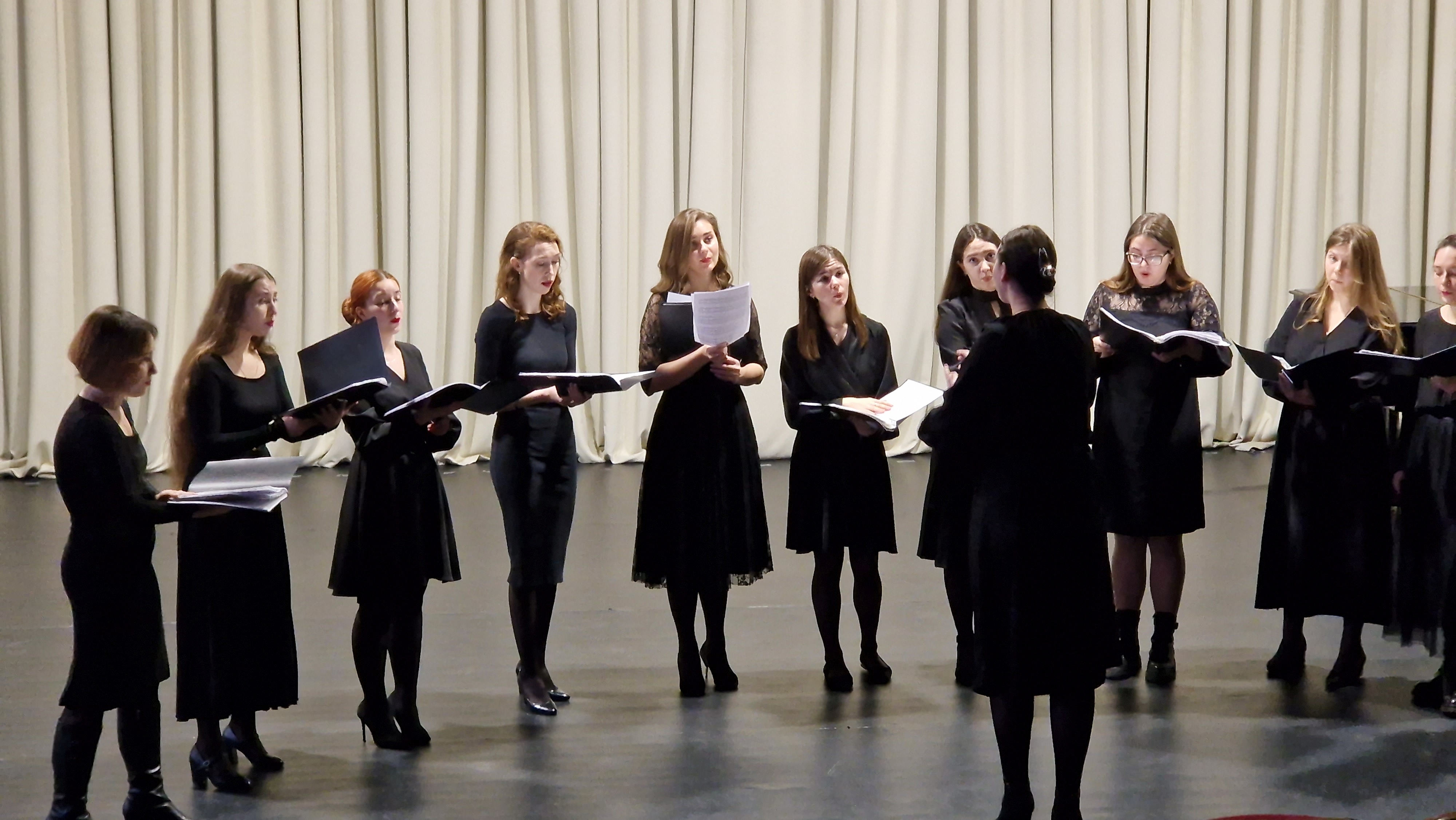 2 ноября в Большом зале Воронежского государственного института искусств состоялся небольшой, но очень важный для обучающихся концерт хоровой музыки. Главным в нем было то, что хором дирижировали сами студенты разных курсов, в рамках прохождения дирижерской практики. Учащиеся смогли попробовать здесь себя уже в роли художественных руководителей: сами выбрали сочинения, сами разучили их с хором в течение двух месяцев, и выступили на сцене в качестве дирижеров. В концерте показали свои достижения четверо студентов 2 курса с женским хором (руководитель практики – преподаватель А. В. Бударов) и пятеро студентов 3 курса с камерным хором (руководитель практики – доцент Н. Н. Матвеев). Надо сказать, что далеко не во всех учебных заведениях дают работать с хором студентам младших курсов, обычно время для этого выделяется только выпускникам для подготовки их государственной программы.