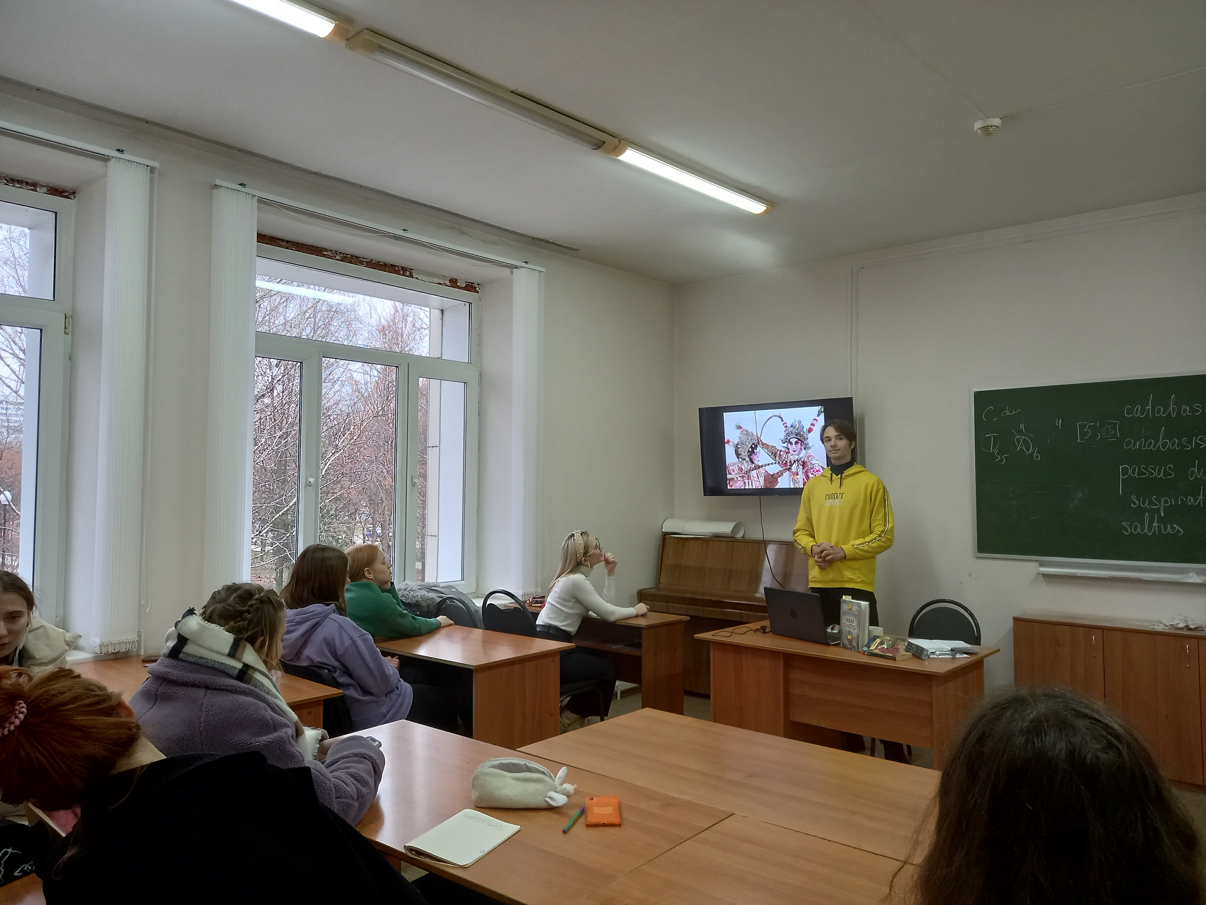 Студенты 2 курса театрального, музыкального факультетов и факультета живописи выступили с докладами «Конфуцианство и традиционный китайский театр» (Мачехин Никита), «Станиславский и йога» (Кравченко Анжелика, Пастушенко Анастасия), «Социальные утопии Возрождения в живописи» (Овчинникова Ксения).