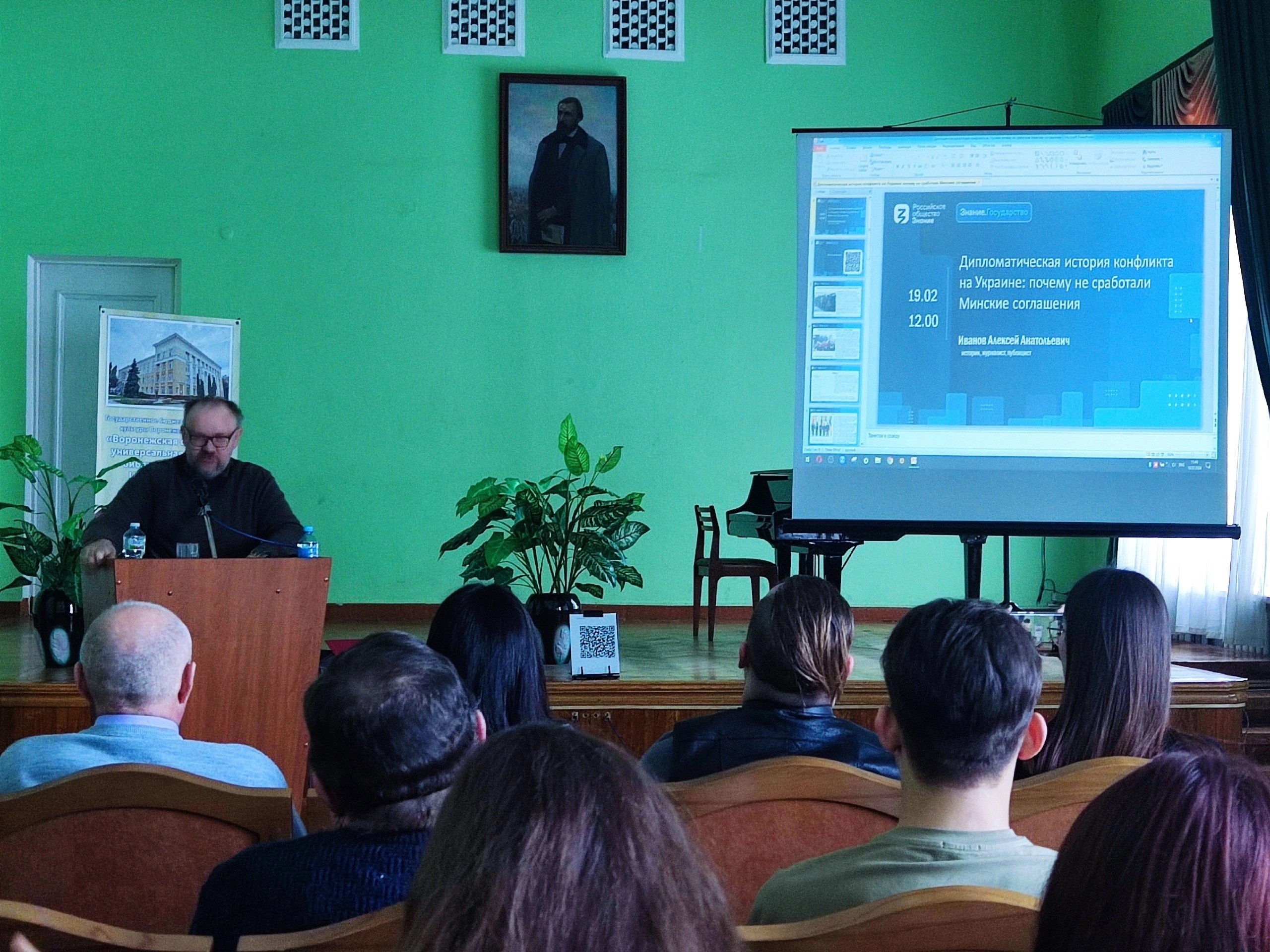 19 февраля 2024 года в Воронежской областной научной библиотеке им. И.С. Никитина студенты нашего вуза прослушали лекции на темы: "Глобальный контекст украинского кризиса" и "Дипломатическая история конфликта на Украине: почему не сработали Минские соглашения". В качестве лектора выступал Иванов Алексей Анатольевич - журналист, историк, публицист, автор книг "Лектор", выпущенные при поддержке Совета при Президенте России по межнациональным отношениям. Мероприятия проходят по всей стране с привлечением специалистов Российского общества "Знание", Российского военно-исторического общества, Русского географического общества, Российского исторического общества.