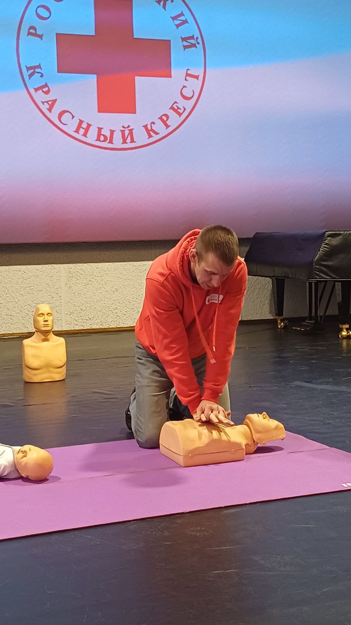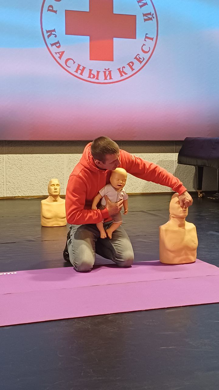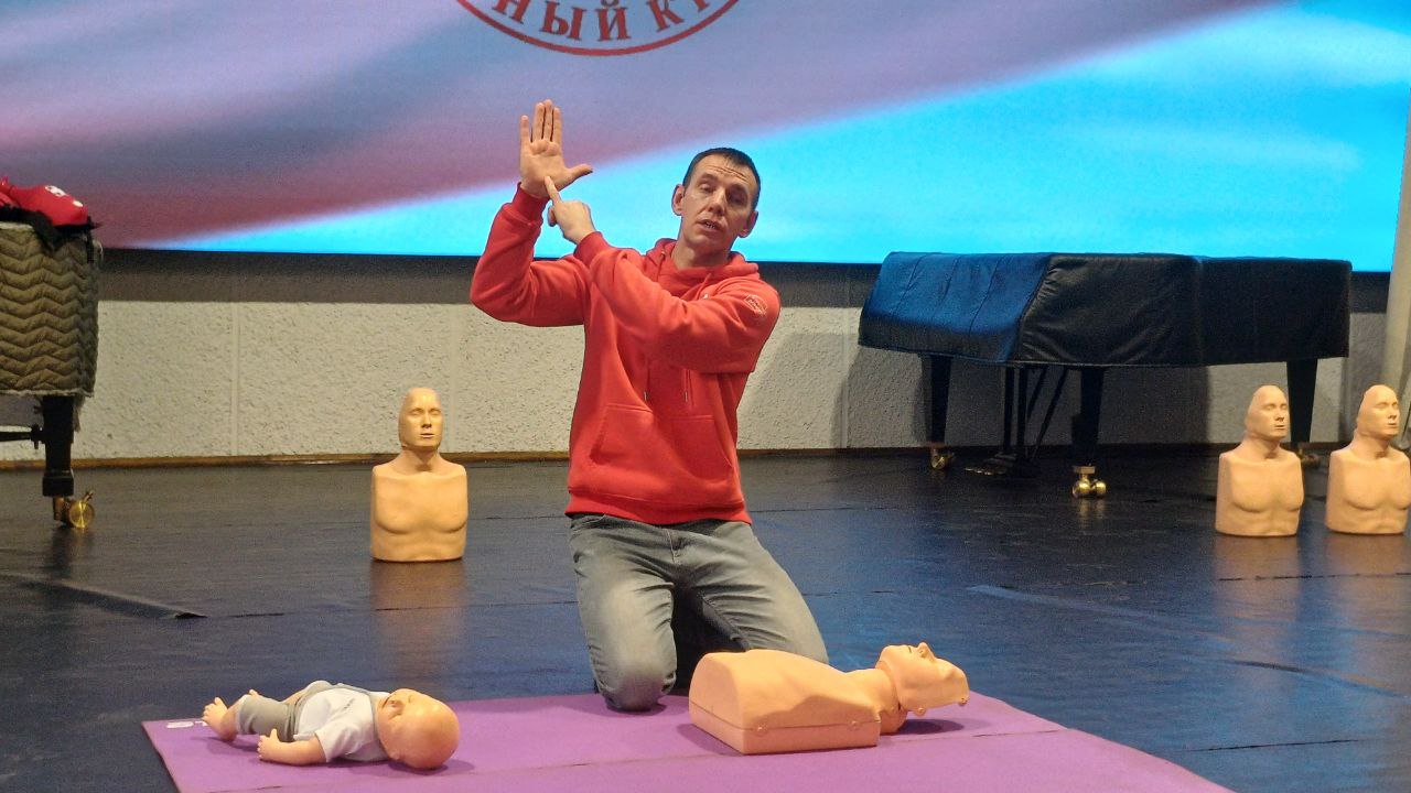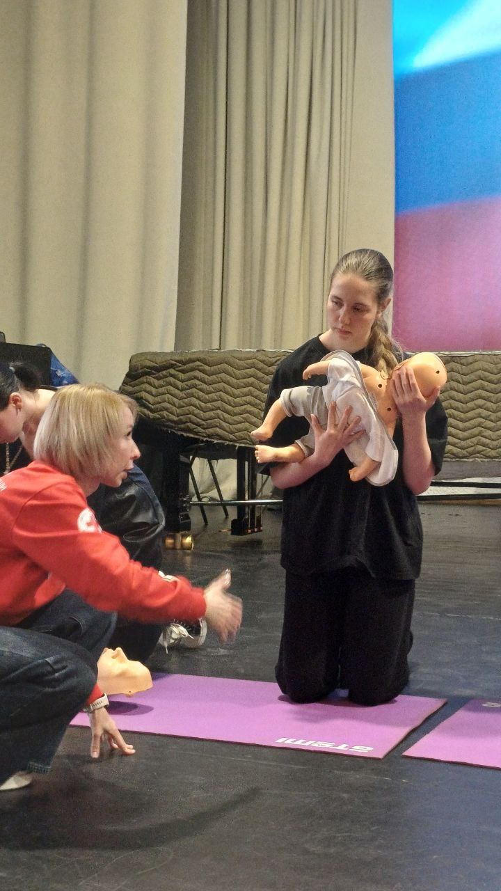 На практической части тренинга инструкторы демонстрировали на манекенах, как с использованием специальных и подручных средств грамотно провести сердечно-лёгочную реанимацию взрослым, подросткам и маленьким детям.