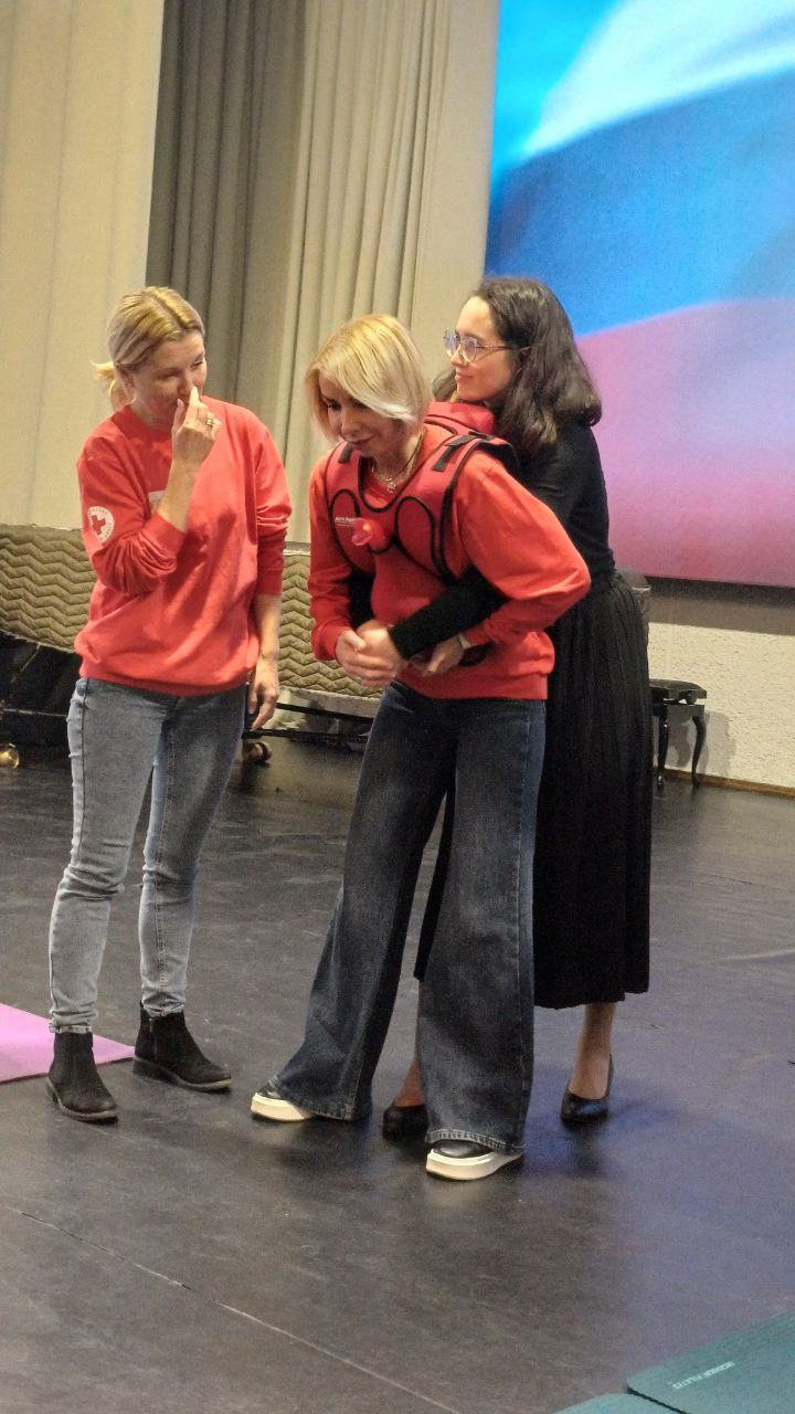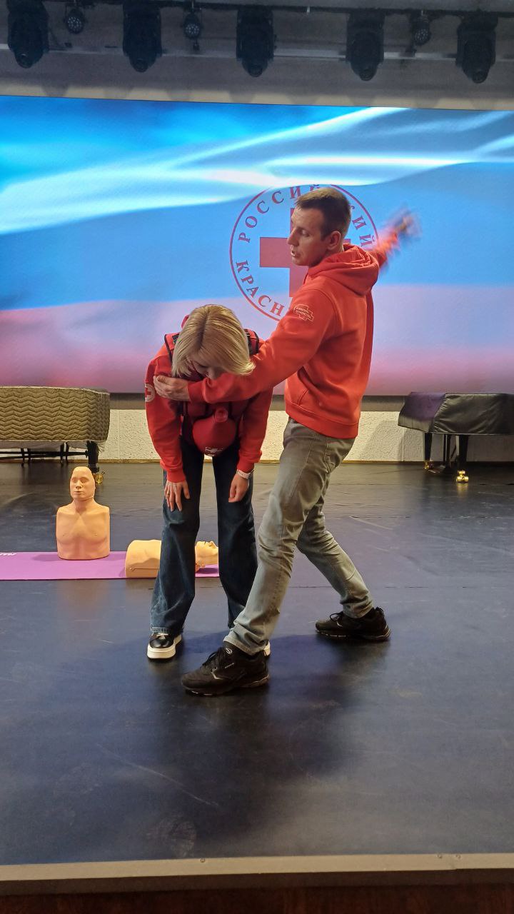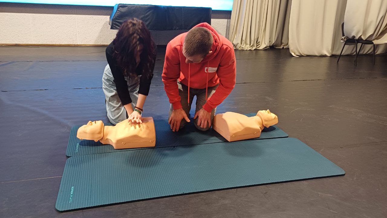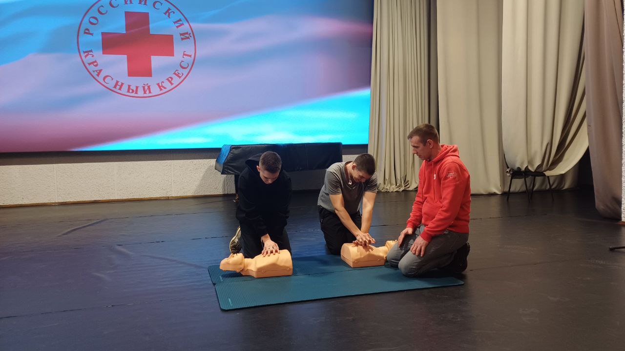 На практической части тренинга инструкторы демонстрировали на манекенах, как с использованием специальных и подручных средств грамотно провести сердечно-лёгочную реанимацию взрослым, подросткам и маленьким детям.