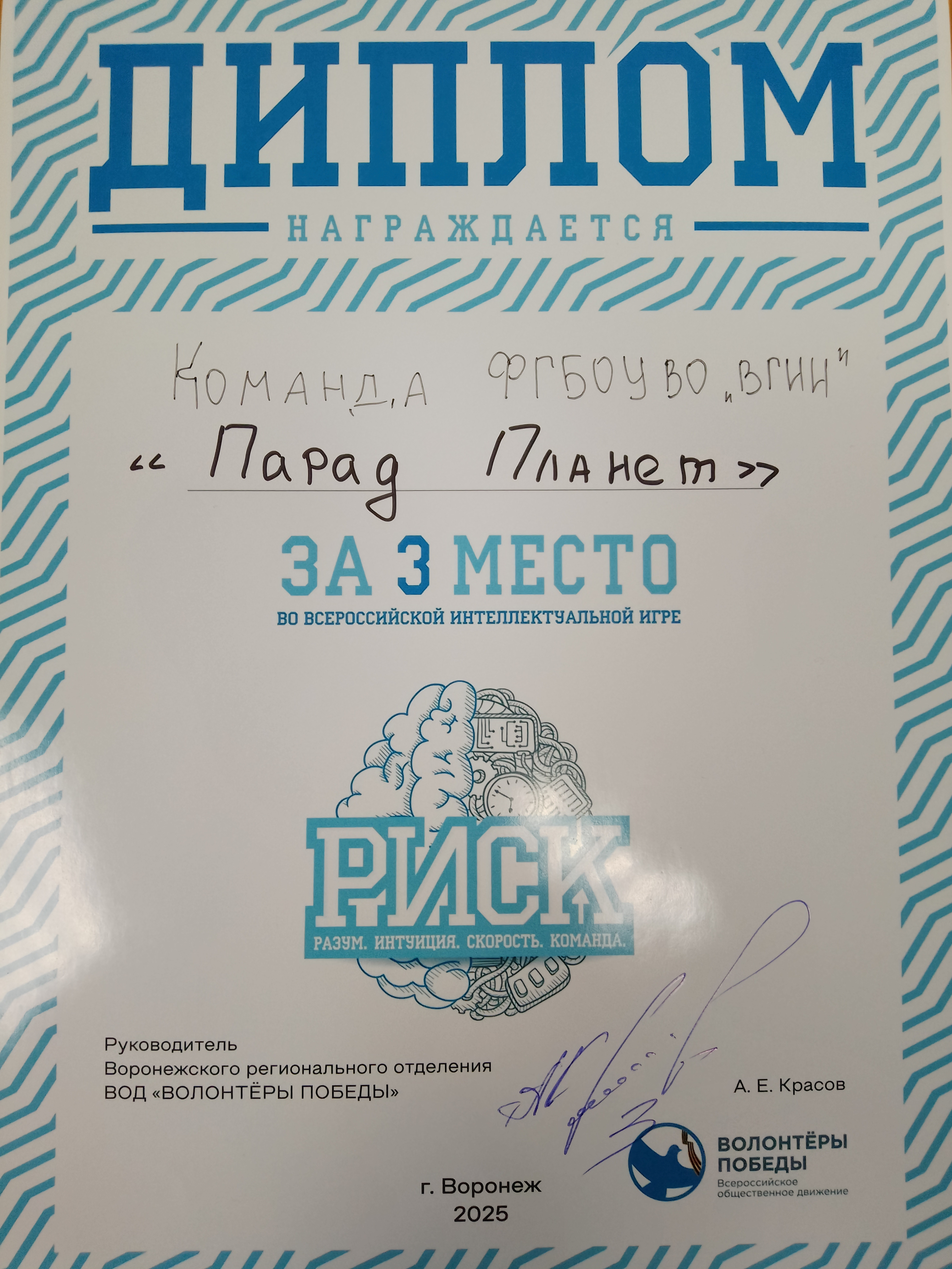 По результатам 3 раундов команда ВГИИ «Парад планет» заняла 3 место, была награждена дипломом и сувенирной продукцией.