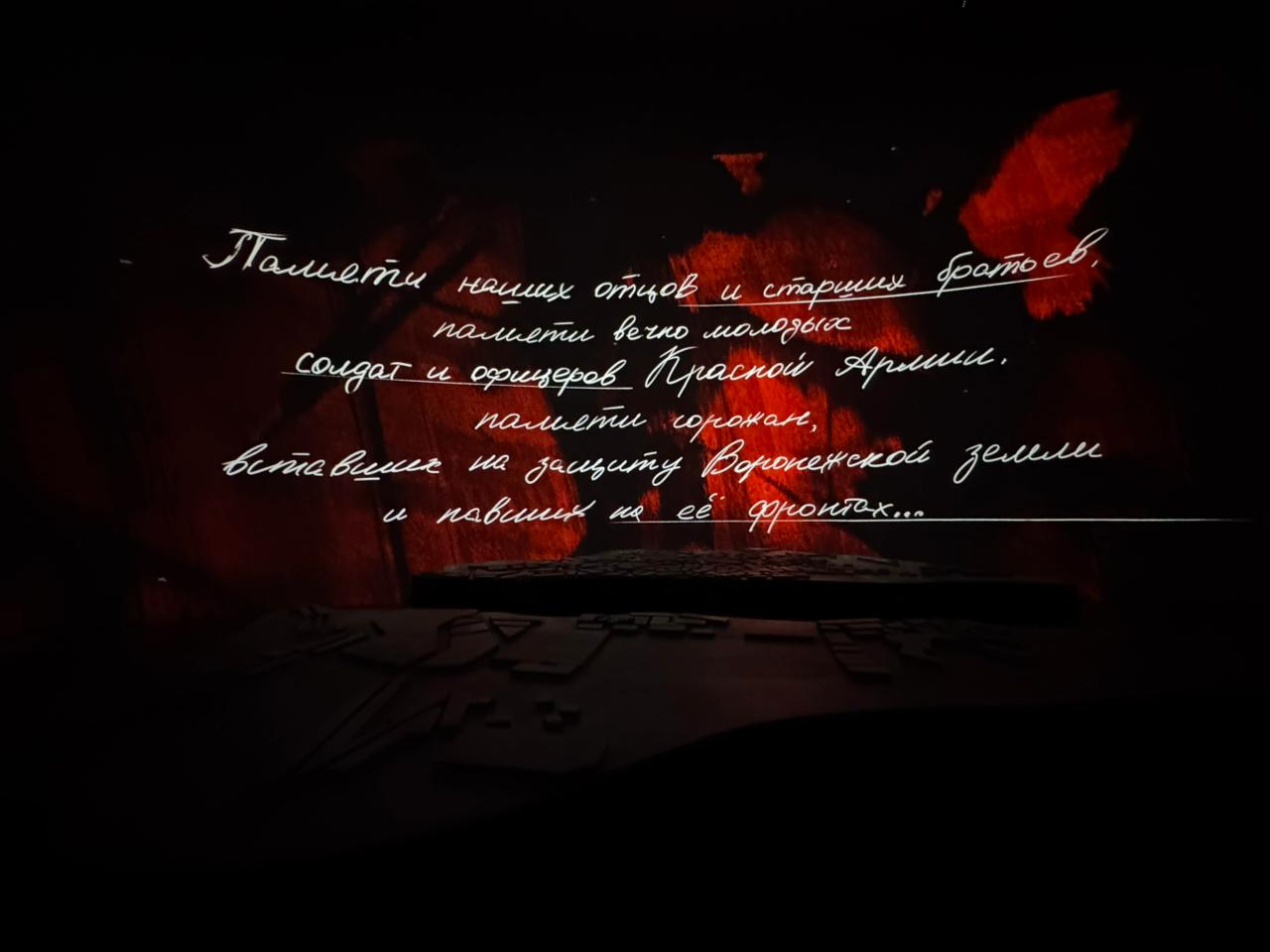 В процессе посещения музея была осмотрена экспозиция «Мультимедийная диорама». Мультимедийная 3d диорама повествует об истории предвоенного Воронежа, Воронежского сражения 1942-1943гг., и о послевоенном восстановлении нашего города. Посетители выставки также узнали об истории присвоения г. Воронежу звания «Города воинской славы» в 2008г.