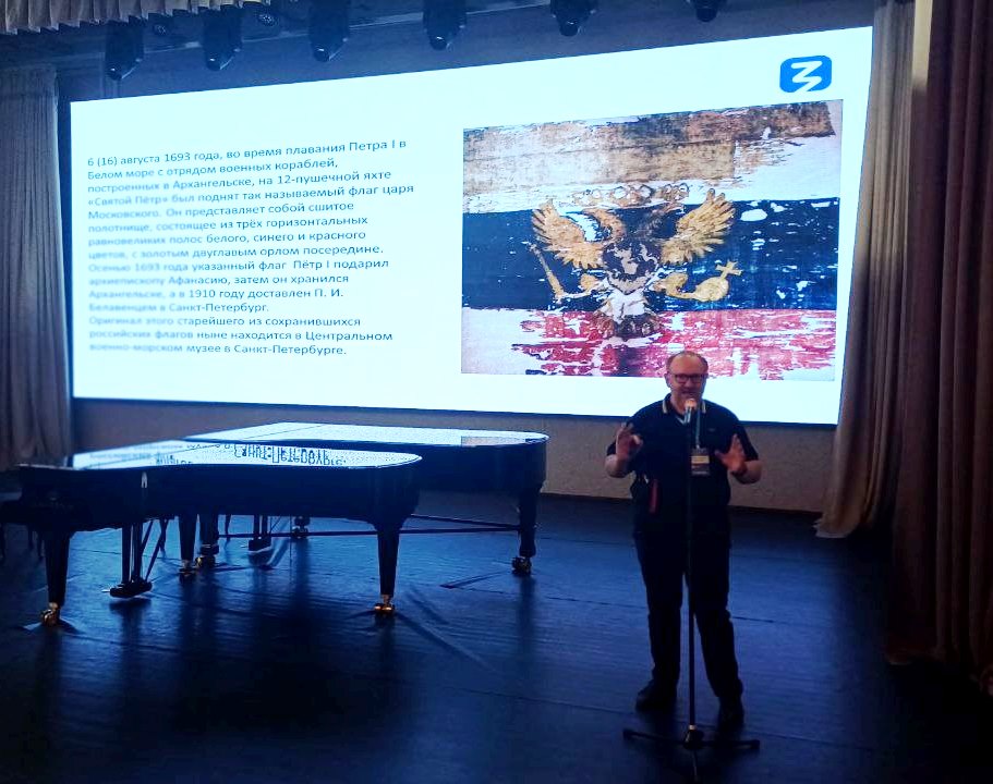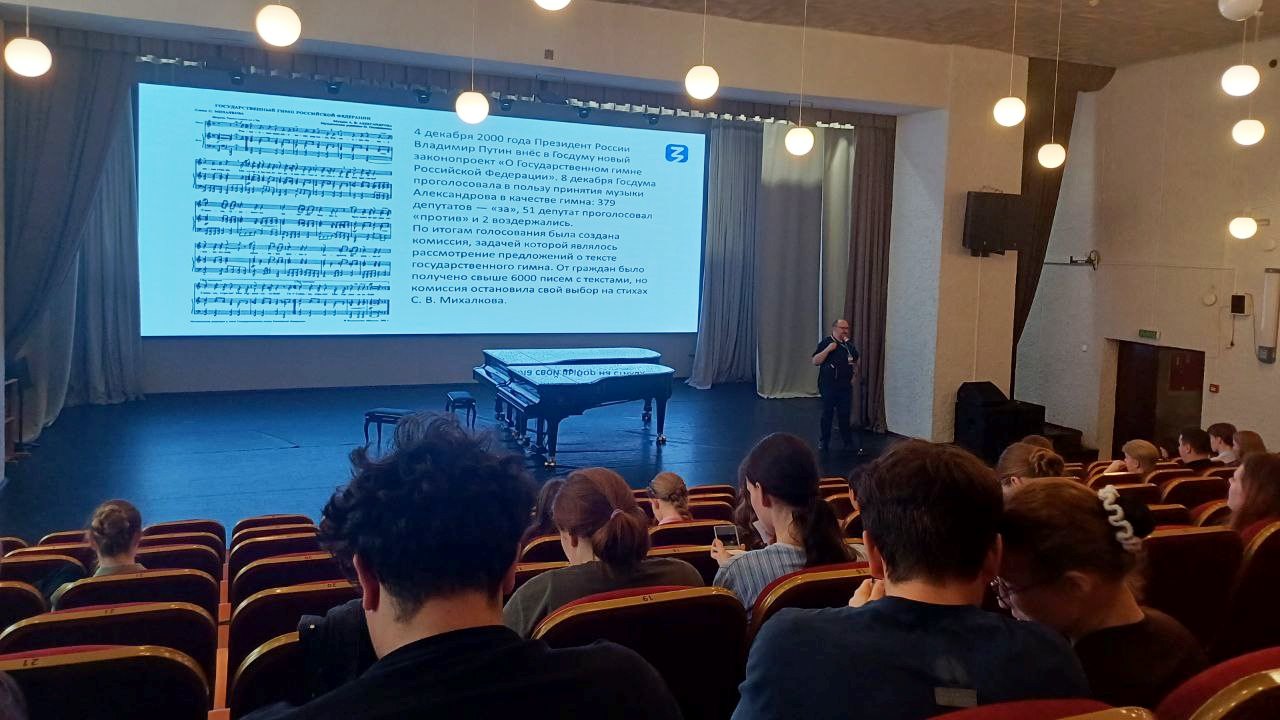В процессе лекции присутствующие узнали об истории возникновения государственных символов нашей страны: флага, герба и текста гимна, а также о том, какие изменения они претерпевали в зависимости от той или иной исторической эпохи.
