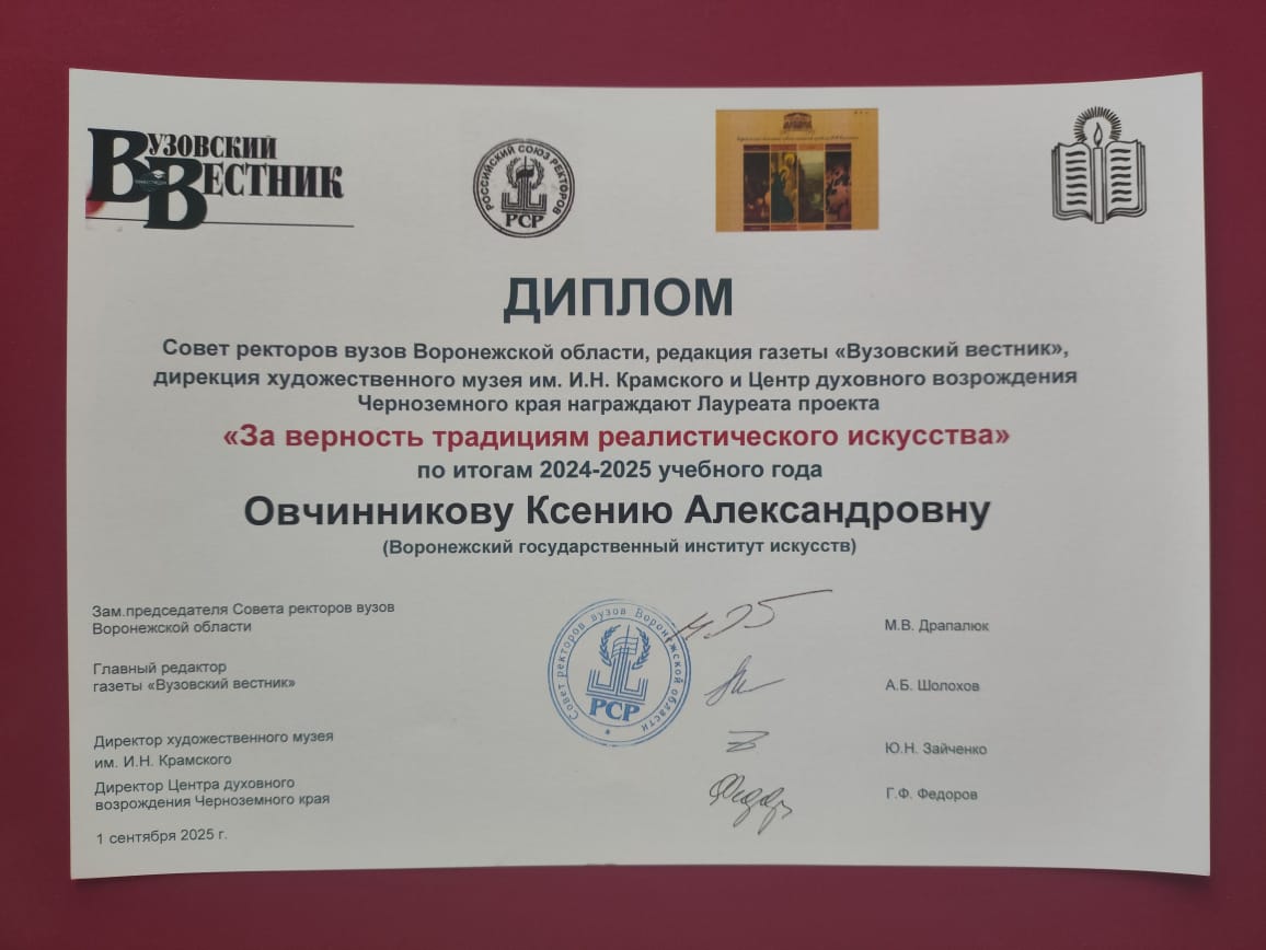 Поздравляем Овчинникову Ксению, студентку 4 курса факультета живописи Воронежского государственного института искусств с получением диплома Совета ректоров вузов Воронежской области, редакции газеты "Вузовский вестник" дирекции художественного музея им И.Н. Крамского и Центра духовного возрождения Черноземного края "За верность традициям реалистического искусства" по итогам 2024-2025 учебного года!