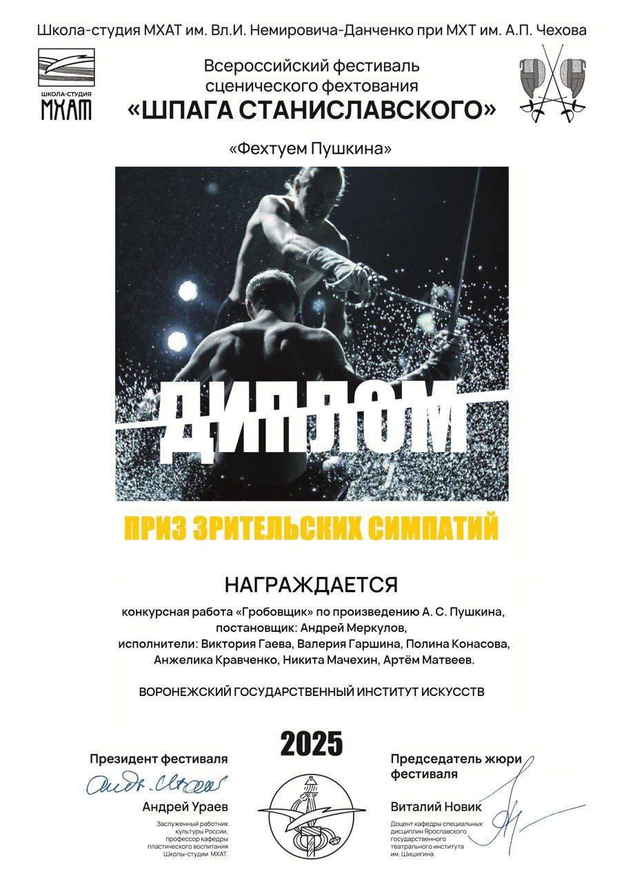 Студенты четвертого курса театрального факультета Воронежского государственного института искусств (ВГИИ) успешно выступили на престижном Всероссийском фестивале сценического фехтования «Шпага Станиславского». Яркой кульминацией их участия стала победа в номинации «Приз зрительских симпатий».