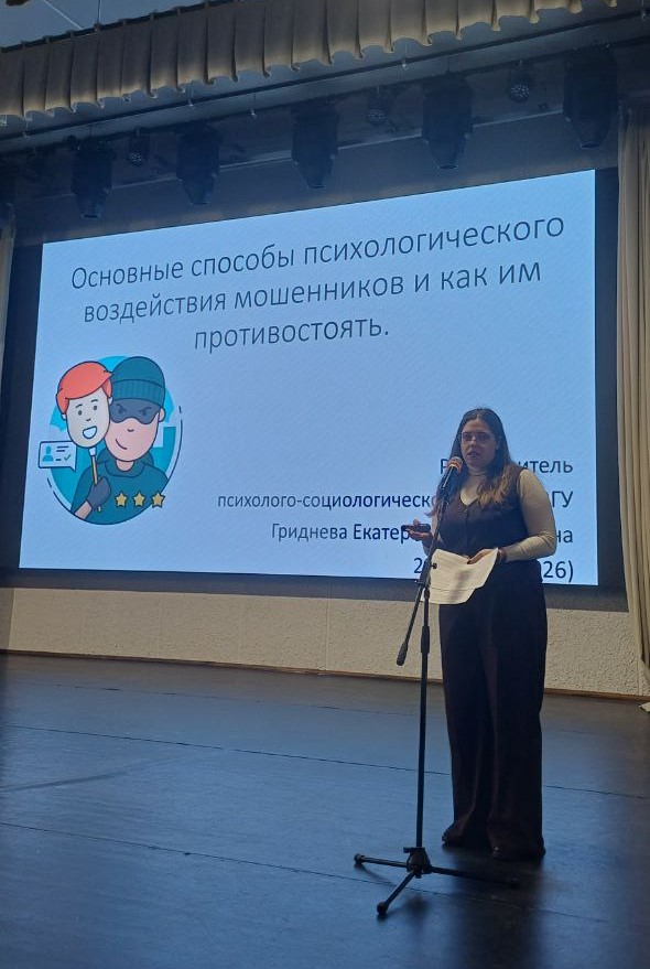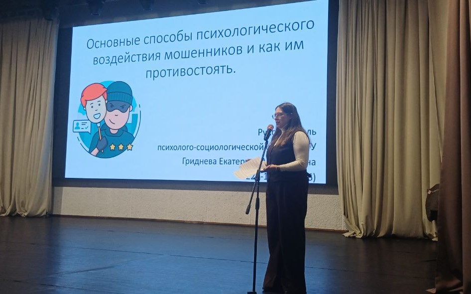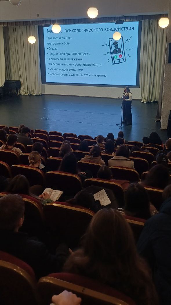 Мероприятие продолжилось выступлением руководителя психолого-социологической службы ВГУ Е.М. Гридневой. Она рассказала студентам об  основных способах  психологического воздействия мошенников;  отдельных чертах характера, присущим как мошенникам, так и их потенциальным жертвам; дала рекомендации по распознаванию мошеннических действий, а также поделилась техниками  и практиками для снятия стресса.