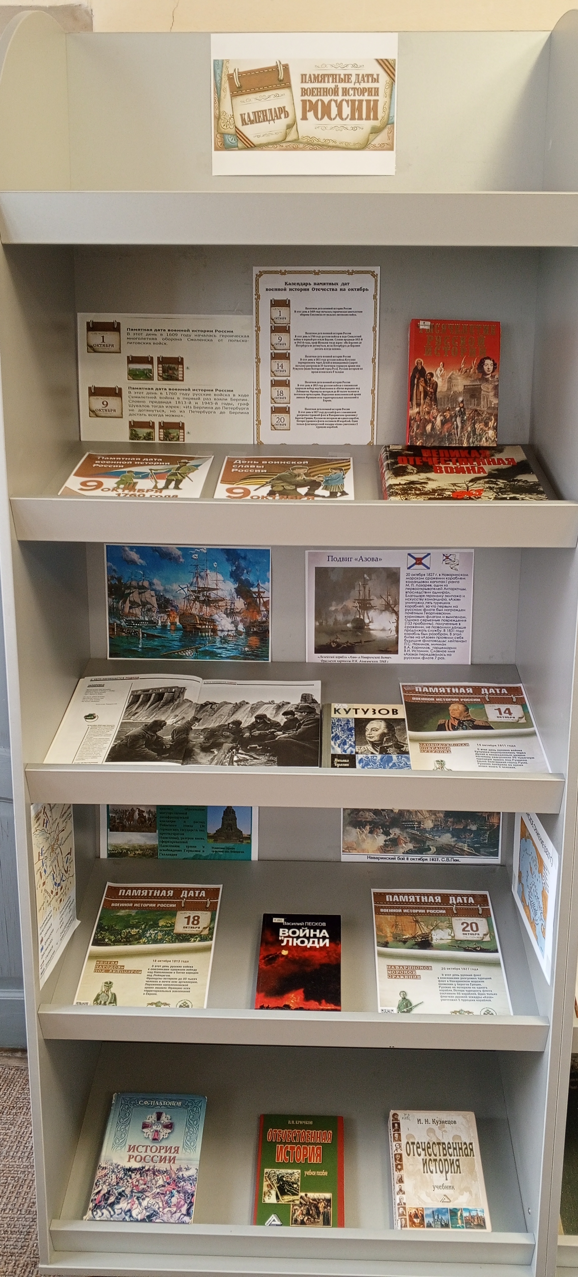 Библиотека и института искусств приглашает на открытый иллюстративно-книжный просмотр «Памятные даты военной истории России – октябрь». Выставка расположена в помещении библиотеки на первом этаже учебного корпуса и посвящена военной истории Отечества.