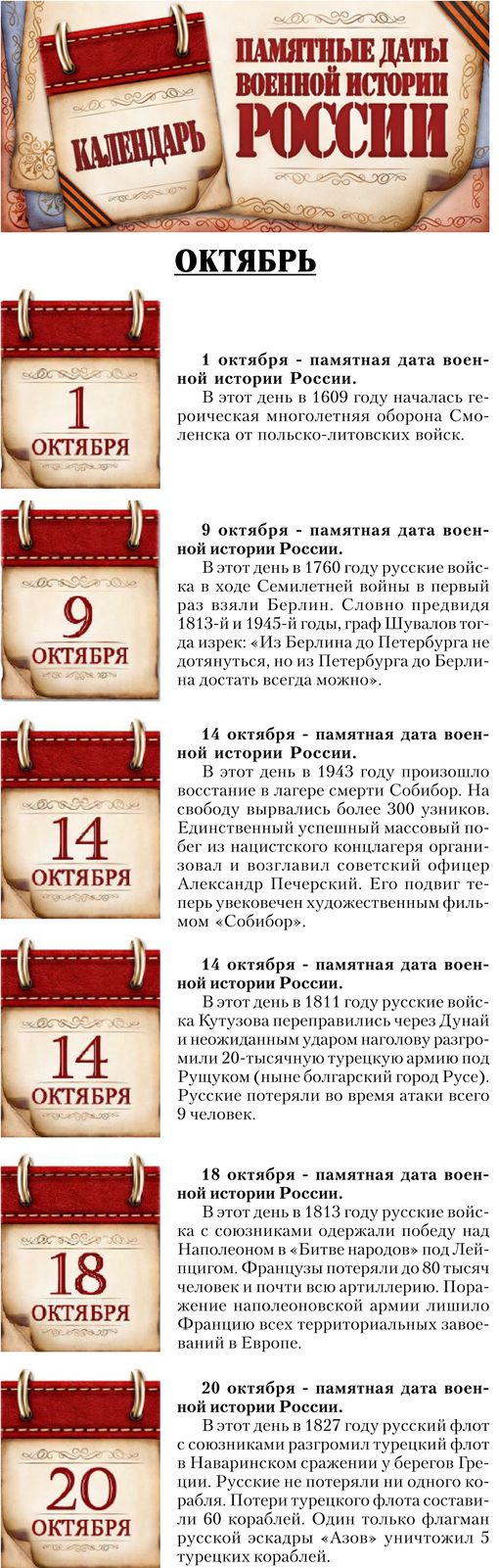 «Памятные даты военной истории Отечества» – это совместный проект Российского военно-исторического общества и Российского организационного комитета «Победа». В нем собраны памятные даты российской военной истории, знаменательные сражения, именах героев, полководцев и военачальников, Дни воинской славы России.