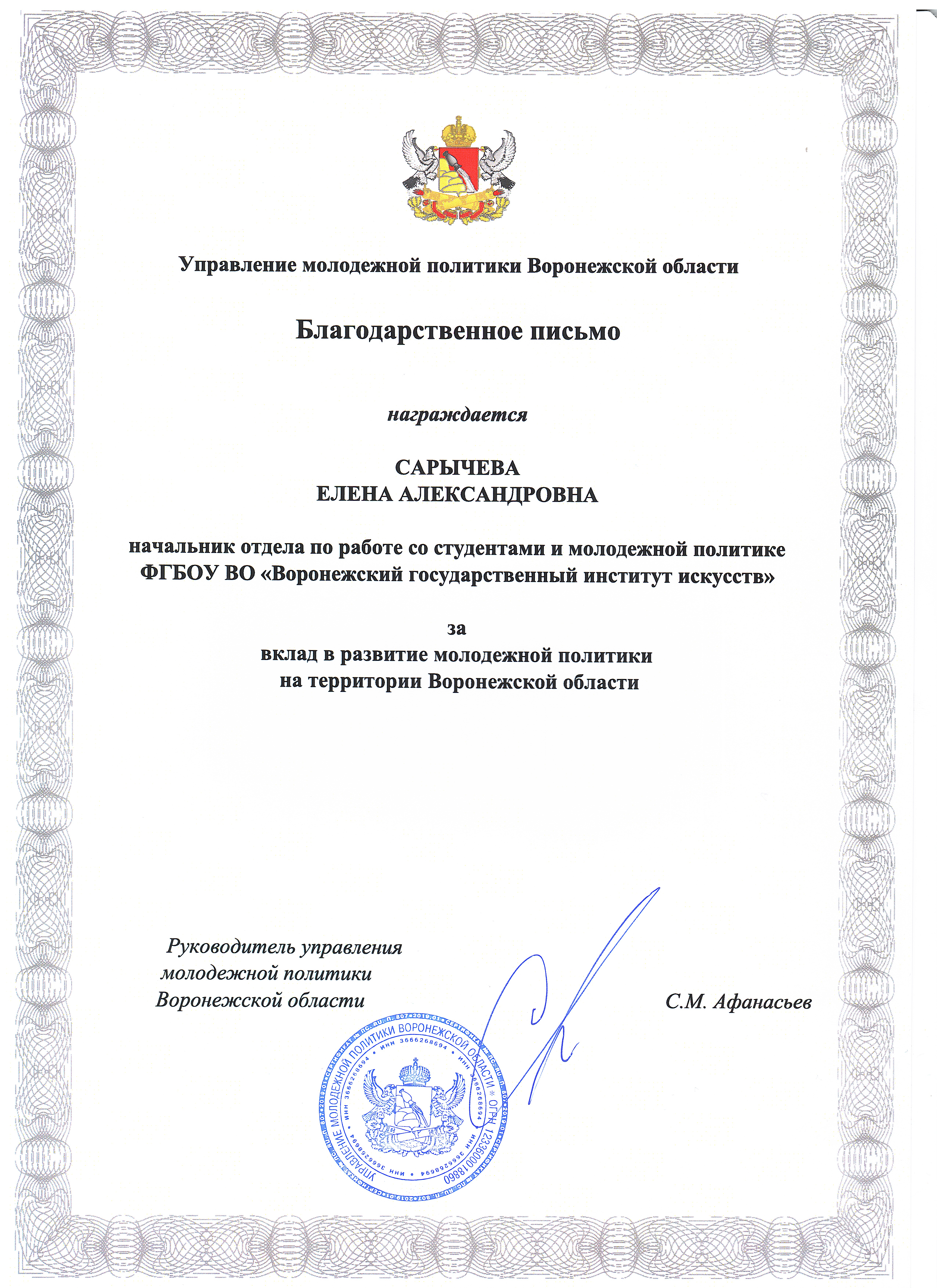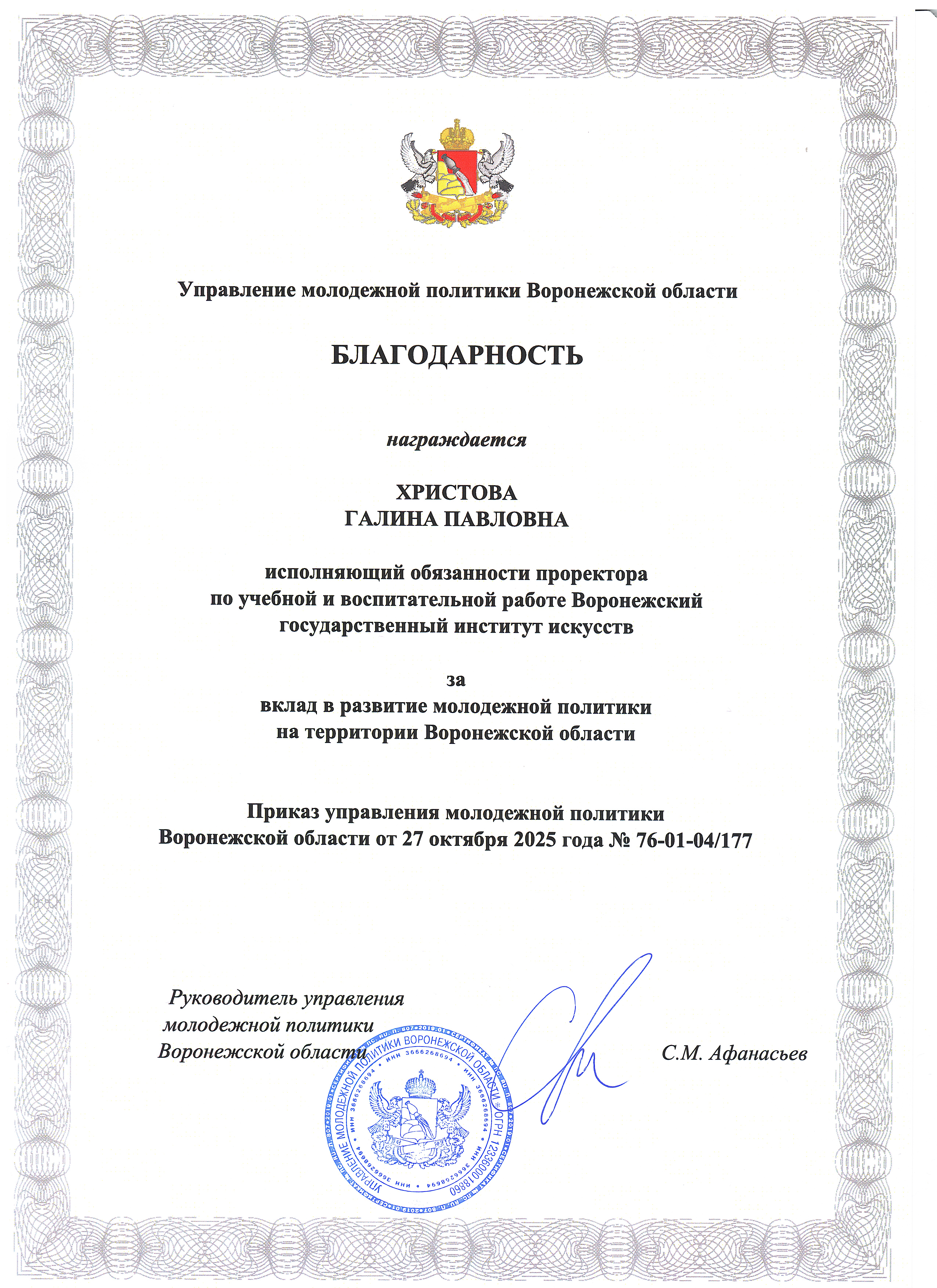 Мероприятие было проведено с целью подведения итогов осуществления молодежной политики за 2025г. Его программа включила в себя церемонию награждения лиц, активно участвующих в реализации молодежной политики на территории Воронежской области. От Воронежского государственного института искусств были награждены благодарностью проректор по учебной и воспитательной работе Г.П. Христова и благодарственным письмом начальник отдела по работе со студентами и молодёжной политике Е.А. Сарычева.